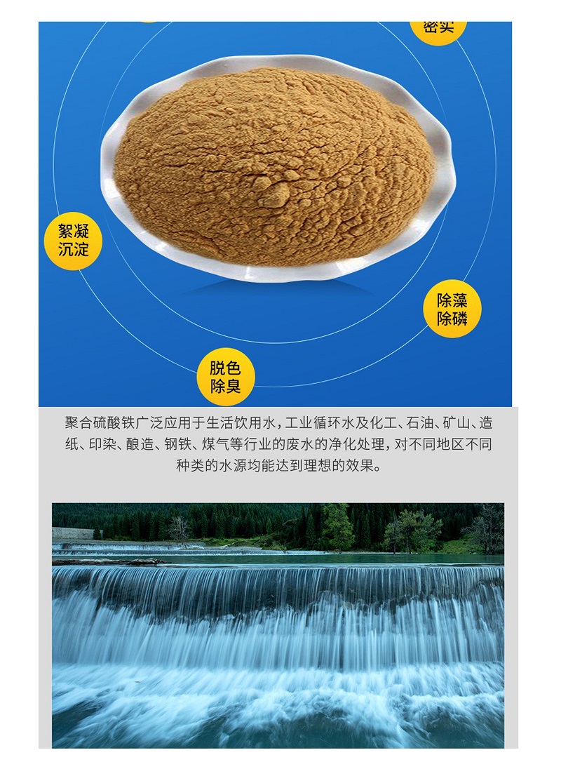 聚合硫酸鐵是一種粘稠的液體或固體,具有快速混溶、中和電荷、水解架橋、混凝沉淀和吸附作用,從而使水迅速沉清,尤其是對(duì)工業(yè)廢水和生活污水處理特殊有效。它完全可以代替堿或氯化鋁水處理劑,比堿式氯化鋁適應(yīng)性大。用聚合硫酸鐵處理水質(zhì)時(shí),耗藥量少,排污量少,處理效果好。生產(chǎn)聚合硫酸鐵原料易得,價(jià)格低廉,并可變廢為寶,是一種值得推廣的理想水處理劑。
