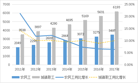 數(shù)據(jù)來源:根據(jù)《2011—2017年度人力資源和社會保障事業(yè)發(fā)展統(tǒng)計公報》《20112017國家統(tǒng)計局農(nóng)民工監(jiān)測調(diào)查報告》整理
