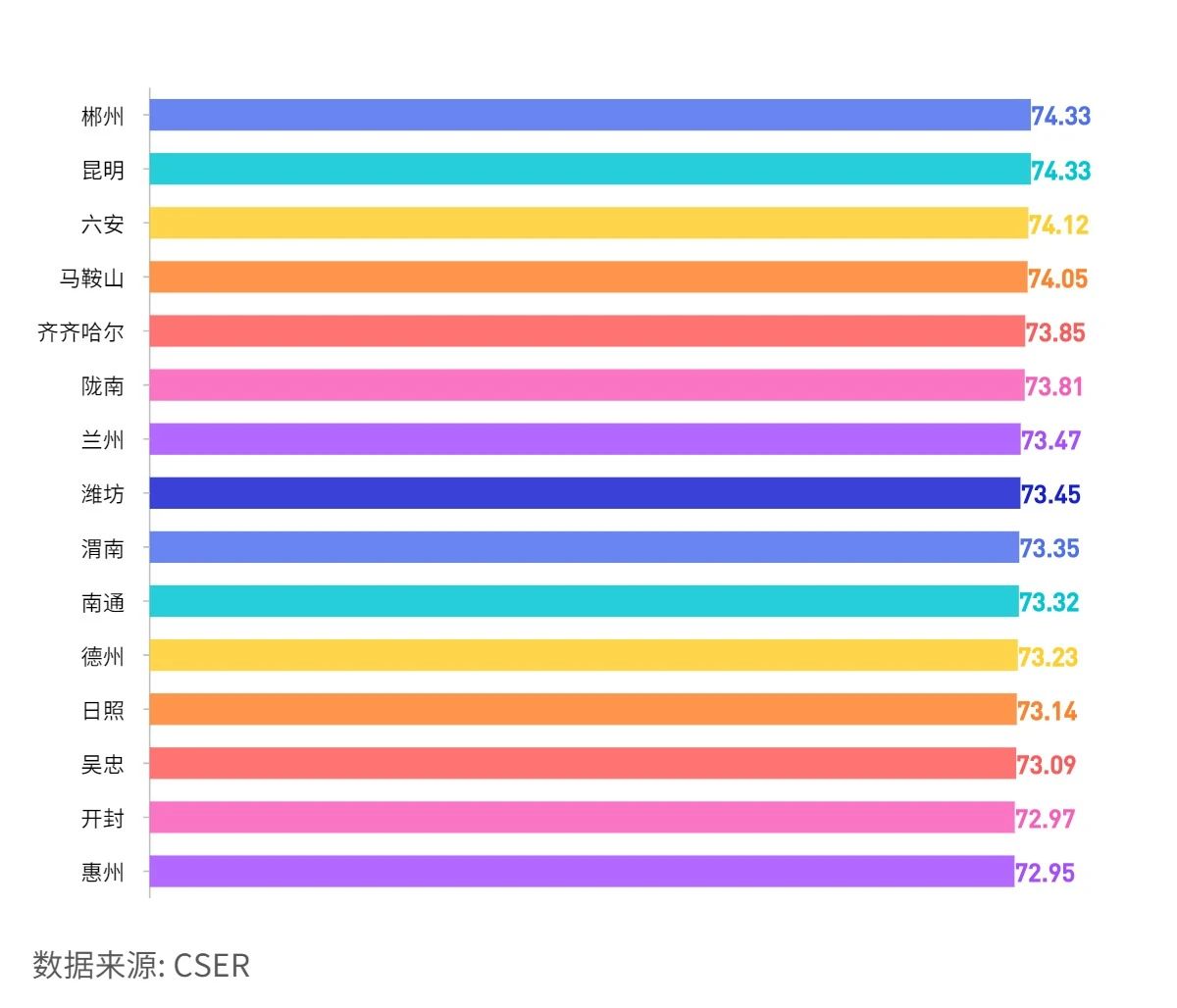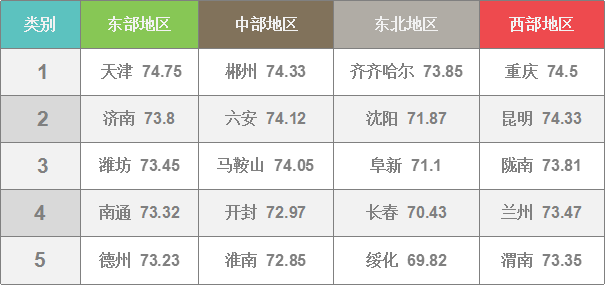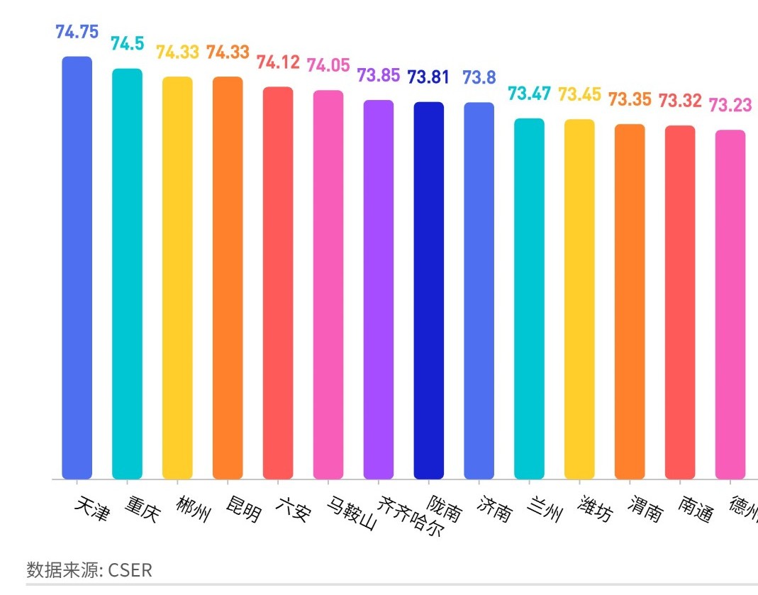 天津74.75,重慶74.5,濟(jì)南73.8,西安73.15,青島73.03,成都72.56,上海72.5,深圳72.19,沈陽(yáng)71.87,杭州70.71,北京70.5,長(zhǎng)春70.43,廣州69.36,寧波69.07,武漢69.02,哈爾濱68.48,大連67.34,南京66.81,廈門(mén)64.32。