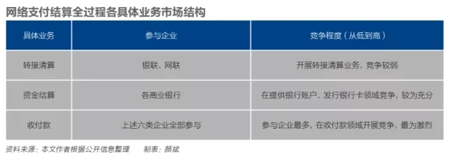 把支付結(jié)算作為一個(gè)完整業(yè)務(wù)來(lái)看,各個(gè)環(huán)節(jié)、各企業(yè)交織在一起,競(jìng)爭(zhēng)力量有較大差距。