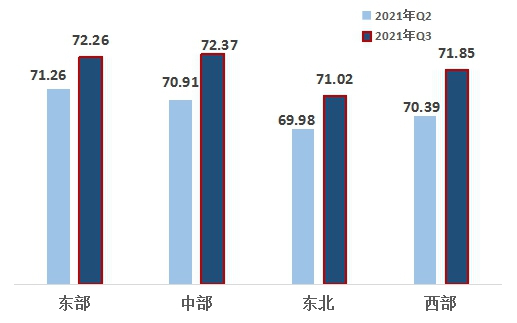 2、中、西部地區(qū)改革熱度指數(shù)提升明顯。四大區(qū)域熱度指數(shù)排名為中部、東部、西部、東北,指數(shù)分別為72.37、72.26、71.85、71.02。中部地區(qū)再次領(lǐng)先,西部地區(qū)指數(shù)增幅超越東部、東北地區(qū)。