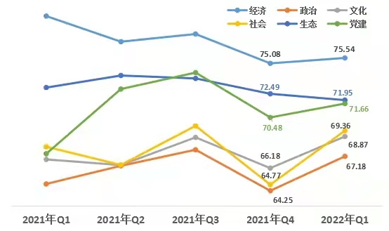 1、從領域來看,經濟領域增幅低于其他領域。第一季度,經濟領域得分75.54,政治領域得分67.18 ,文化領域得分68.87,社會領域得分69.36,生態(tài)領域得分71.95,黨建領域得分71.66。與上一季度相比,生態(tài)領域小幅下降,其他五個領域均上升。其中社會領域升幅最大,政治領域次之,經濟領域提升最小。