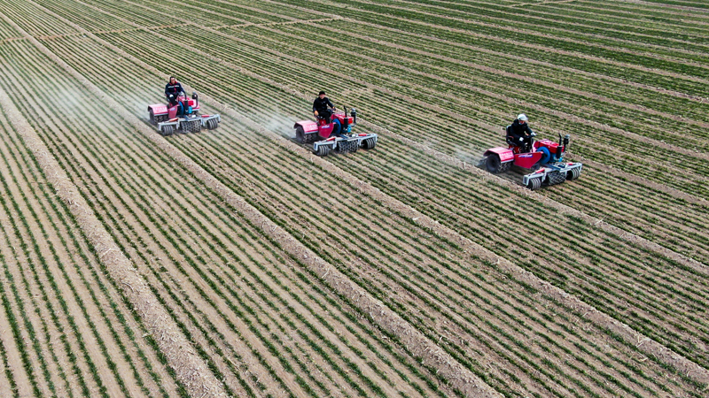 2月17日,在山東省聊城市莘縣妹冢鎮(zhèn),農(nóng)民在麥田里進(jìn)行鎮(zhèn)壓保墑作業(yè)(無人機(jī)照片)。新華社記者 郭緒雷 攝