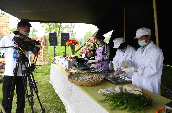 圖為近日安徽省肥西縣柿樹(shù)崗鄉(xiāng)村民通過(guò)“云上”直播制作當(dāng)?shù)靥厣朗?。新華社記者 劉軍喜 攝