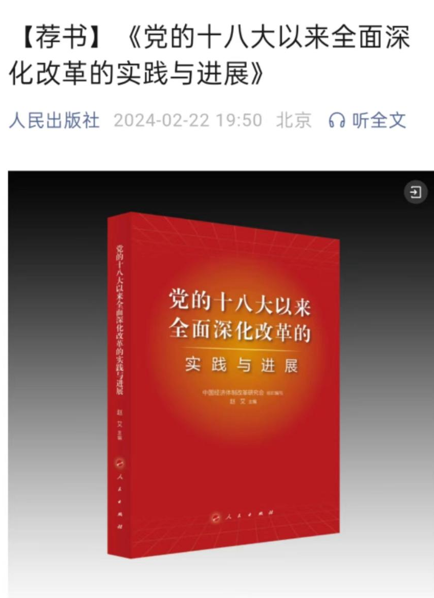2024年2月22日,由我會(huì)組織編寫,會(huì)長(zhǎng)彭森作序、常務(wù)副會(huì)長(zhǎng)兼秘書長(zhǎng)趙艾主編的《黨的十八大以來(lái)全面深化改革的實(shí)踐與進(jìn)展》一書,入選人民出版社官方微信公眾號(hào)[薦書]欄目,成為人民出版社推薦的新書。
