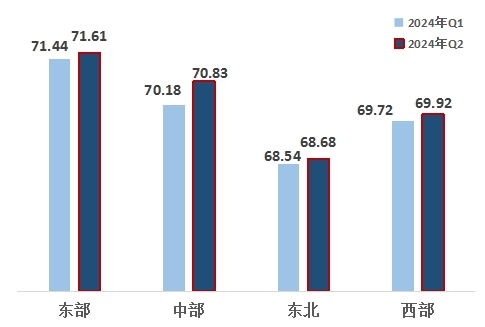 從四大區(qū)域來看,東部、中部、東北、西部地區(qū)指數(shù)分別為71.61、70.83、68.68、69.92。四大區(qū)域排名與上一季度保持一致,分別為東部第一,中部第二,西部第三,東北第四。與上一季度相比,四大區(qū)域改革熱度指數(shù)均有小幅提升,中部地區(qū)增幅最大。