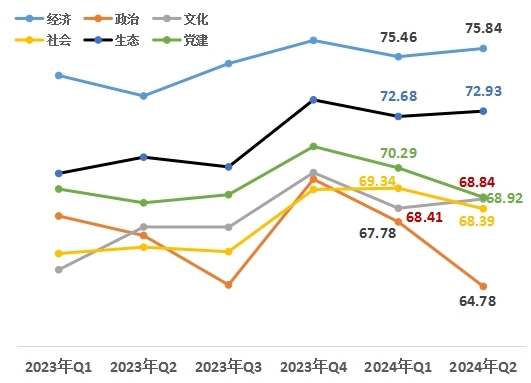 從改革熱度指數(shù)的六大領(lǐng)域來看,經(jīng)濟領(lǐng)域75.84,政治領(lǐng)域64.78,文化領(lǐng)域68.84,社會領(lǐng)域68.39,生態(tài)領(lǐng)域72.93,黨建領(lǐng)域68.92。與上一季度相比,經(jīng)濟、文化、生態(tài)領(lǐng)域小幅上升。同比來看,經(jīng)濟、文化、社會、生態(tài)、黨建領(lǐng)域的改革熱度均呈現(xiàn)上升趨勢。