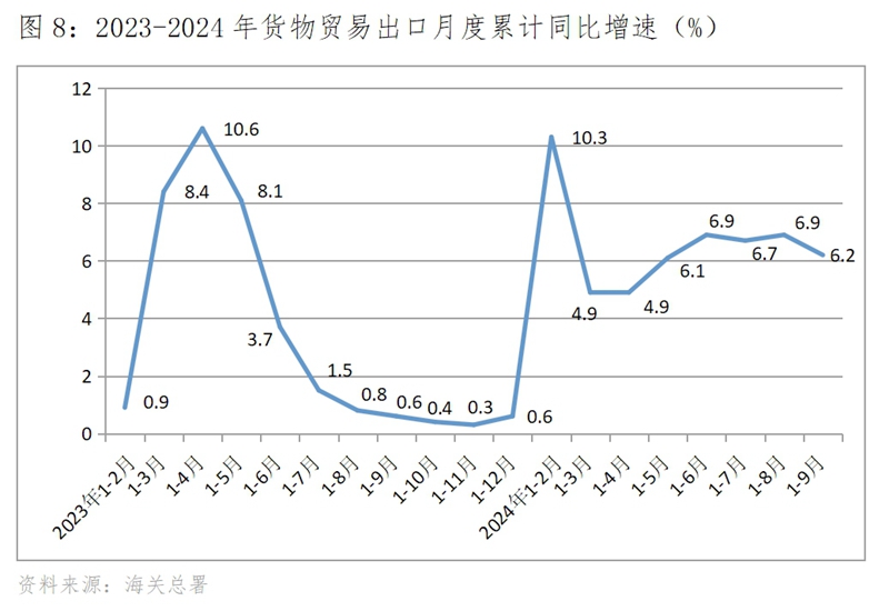 隨著一系列宏觀調(diào)控政策的貫徹落實(shí),包括新增地方政府專項(xiàng)債券、增發(fā)超長期特別國債、大規(guī)模的設(shè)備更新、消費(fèi)品的以舊換新、繼續(xù)減稅降費(fèi)、降準(zhǔn)降息、放寬住房購買限制等政策措施,與上年同期對比,今年以來工業(yè)、投資和出口增速回升,零售和財(cái)政支出增速回落。