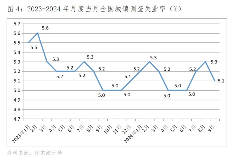 (三)調(diào)查失業(yè)率比上年同期略升,比6月份也略升。9月份城鎮(zhèn)調(diào)查失業(yè)率為5.1%,比上年同期的5.0%回升了0.1個(gè)百分點(diǎn),比6月份的5.0%也回升了0.1個(gè)百分點(diǎn)。從結(jié)構(gòu)上看,青年調(diào)查失業(yè)率還保持在較高水平,8月份全國城鎮(zhèn)不包含在校生的16-24歲的調(diào)查失業(yè)率為18.8%,比上年12月份的14.9%回升3.9個(gè)百分點(diǎn),就業(yè)壓力仍還比較大。