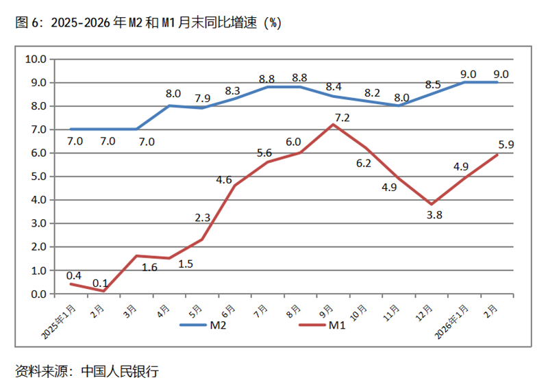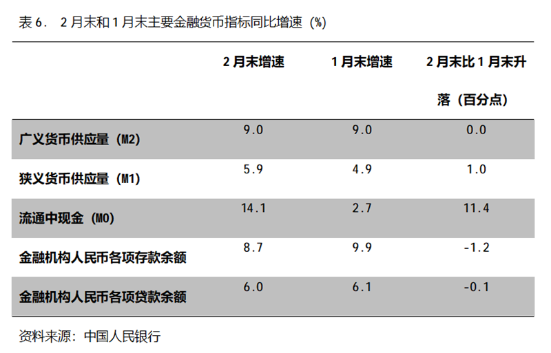 六、M2增速由升轉(zhuǎn)平。2月末,廣義貨幣供應量(M2)同比增長9.0%,與1月份末增長9.0%持平,1月末增幅比上年末增長8.5%回升0.5個百分點;狹義貨幣供應量(M1)同比增長5.9%,比1月末增長4.9%回升1.0個百分點,1月末增幅比上年末增長3.8%回升1.1個百分點;流通中貨幣(M0)同比增長14.1%,比1月末增長2.7%回升11.4個百分點,1月末增幅比上年末增長10.2%回落7.5個百分點。2月末,雖然M2增速與M1增速差距進一步縮小,但仍還保持著不小的差距。