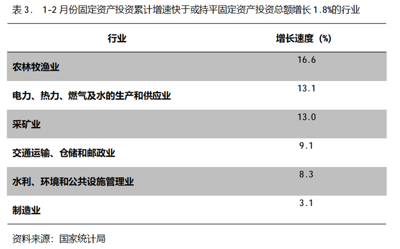 1-2月份,固定資產(chǎn)投資累計增速快于或持平固定資產(chǎn)投資總額增長1.8%的行業(yè)共6個,即農(nóng)林牧漁業(yè)增長16.6%,電力、熱力、燃氣及水的生產(chǎn)和供應業(yè)增長13.1%,采礦業(yè)增長13.0%,交通運輸、倉儲和郵政業(yè)增長9.1%,水利、環(huán)境和公共設(shè)施管理業(yè)增長8.3%,制造業(yè)增長3.1%。