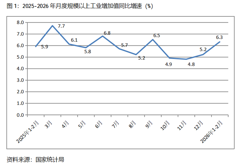 一、工業(yè)增速持續(xù)回升。1-2月份,規(guī)模以上工業(yè)增加值同比增長6.3%,比上年12月份增長5.2%回升了1.1個百分點,上年12月份比上年11月份增長4.8%回升了0.4個百分點。從工業(yè)三大門類看,采礦業(yè)、制造業(yè)和電力、熱力、燃氣及水生產(chǎn)和供應業(yè)增速比上年12月份全面回升,1-2月份,采礦業(yè)同比增長6.1%,比上年12月份增長5.6%回升0.5個百分點;制造業(yè)增長6.6%,比上年12月份增長6.4%回升0.2個百分點;電力、熱力、燃氣及水生產(chǎn)和供應業(yè)增長4.7%,比上年12月份增長2.3回升2.4個百分點。